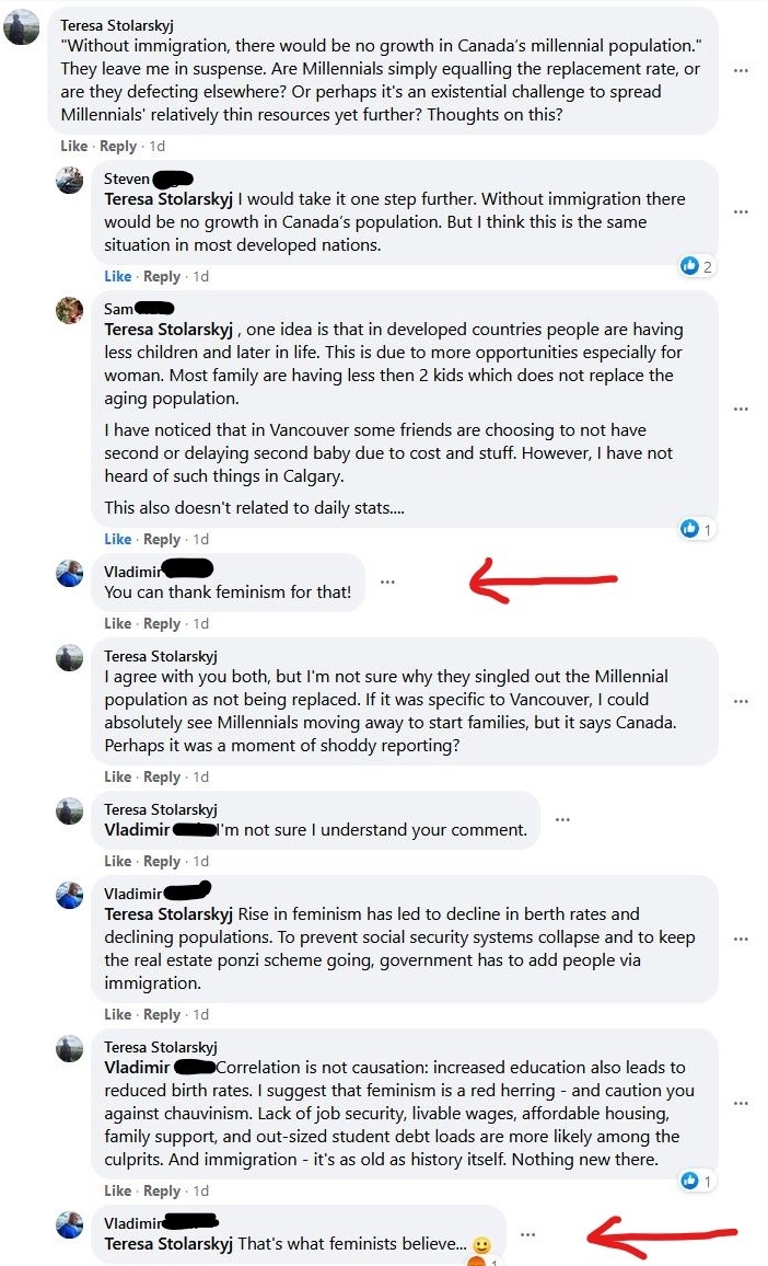 Our friend Vladimir, who is not known to me personally, blames feminism for the falling birth rate in Canada. He may be joking, or serious, or trolling – it is so difficult to say in the online world, where tone fails to convey meaning. Yet that is immaterial. Rather than engaging in the dialogue, as do the other respondents, Vladimir declines to acknowledge other factors which may result in the outcomes he blames feminism for, namely reduced birth rates and the inherent collapse of the social system as a result. No pressure, ladies.